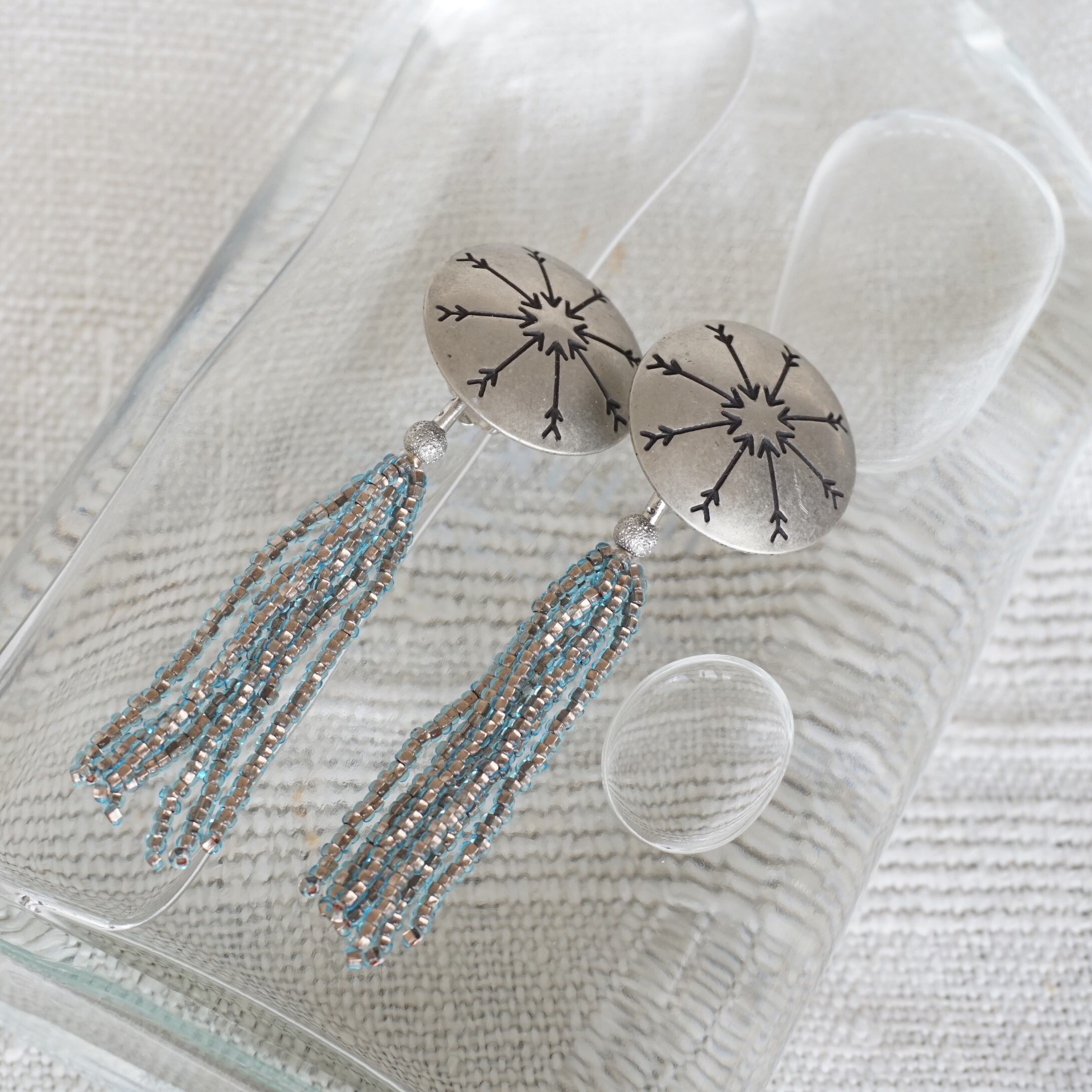 タッセルはチェコ産のシートビーズを使用。水色と銅色のコンビネーションが